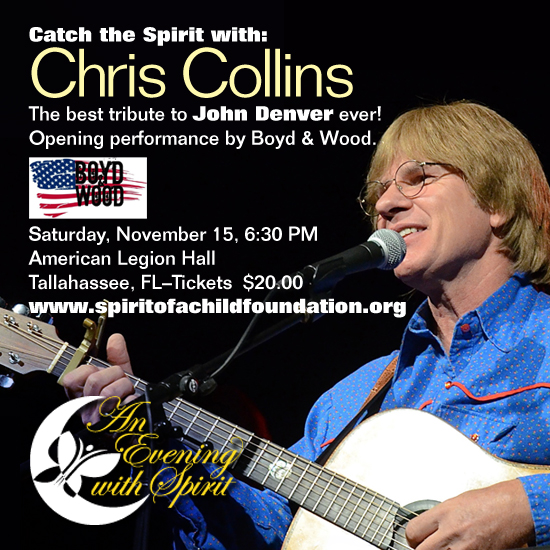 Chris Collins is bringing his tribute to the music of John Denver to Tallahassee for a one night only benefit concert supporting the Spirit of a Child Foundation. Hailed as one of the nation’s most exciting tribute voices, the award-winning performer will be at the American Legion Hall in Tallahassee, Florida on Saturday, November 15, 2014. Doors opening at 6:30pm.