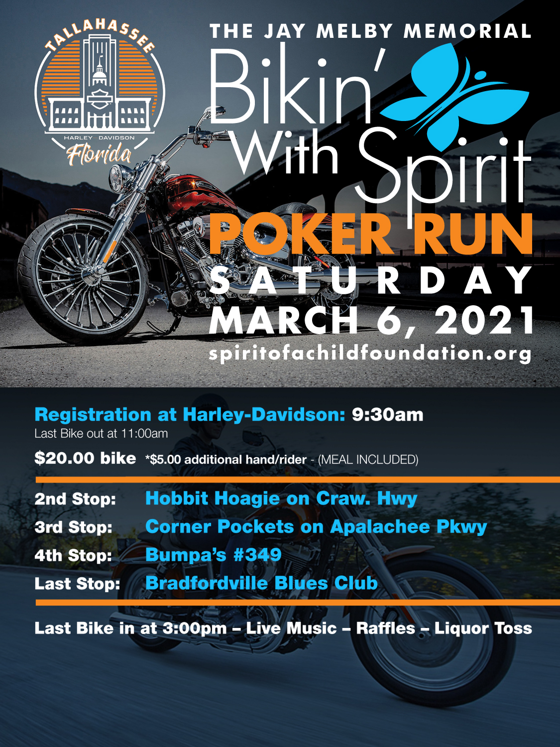 First Bike in / Registration starts at 9:30 am at Tallahassee Harley-Davidson .