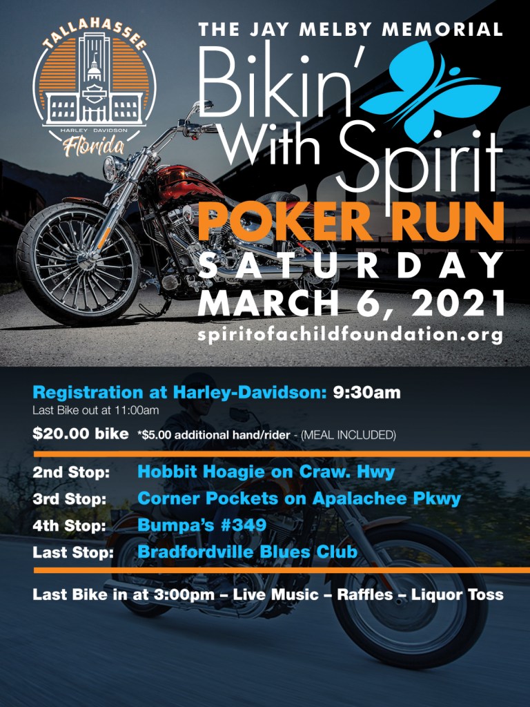 Welcome to the 2nd Annual “Jay Melby Bikin’ With Spirit Poker Run” in partnership with Harley Davidson Motorcycles of Gainesville and Tallahassee. The Spirit of a Child Foundation is dedicating this run to Jay, his love for motorcycles and his love for being there for others. We want all participants to “Catch the Spirit” and have a great time! Just remember most of all — stay safe and thank you for helping our foundation make a difference.