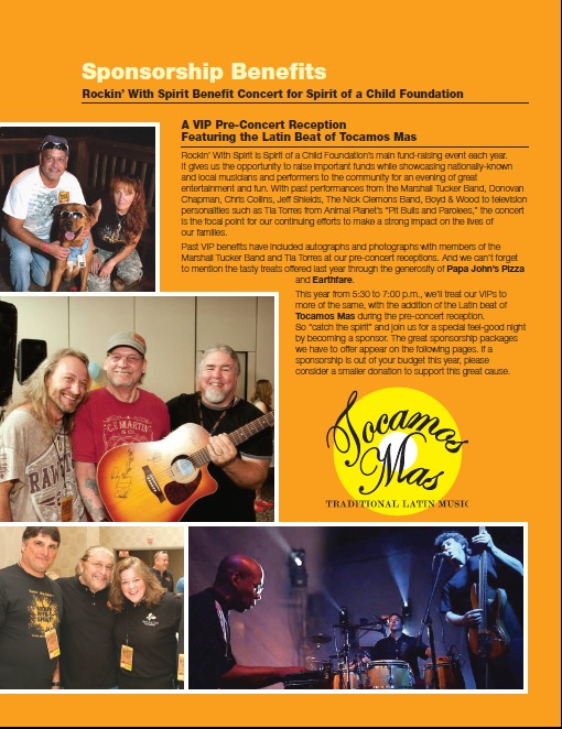 Rockin’ With Spirit is Spirit of a Child Foundation’s main fund-raising event each year. It gives us the opportunity to raise important funds while showcasing nationally known and local musicians and performers to the community for an evening of great entertainment and fun. With past performances from the Marshall Tucker Band, Donovan Chapman, Chris Collins, Jeff Shields, The Nick Clemons Band, Boyd and Wood to television personalities such as Tia Torres from Animal Planet’s “Pit Bulls and Parolees,” the concert is the focal point for our continuing efforts to make a strong impact on the lives of families.