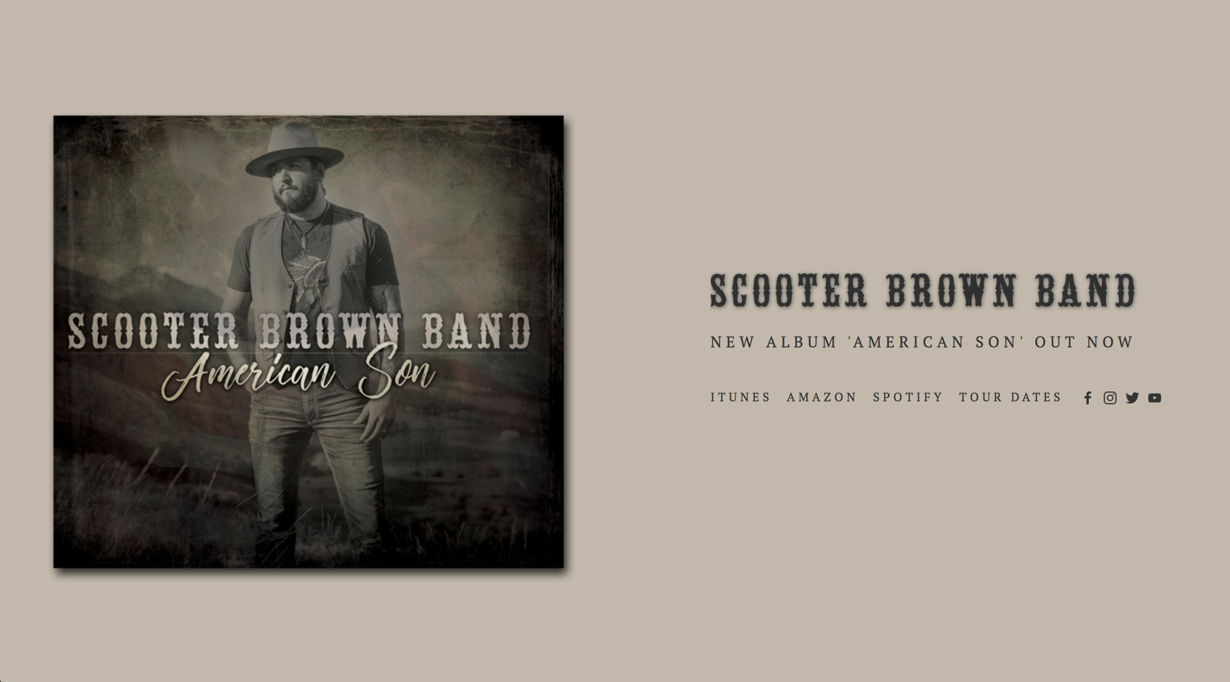 NASHVILLE, Tenn. (September 8, 2017) – Scooter Brown Band releases their debut nationally distributed album today, American Son, including the title-track featuring Country Music Hall of Famer Charlie Daniels. The project, released by Red River / BFD / Sony Orchard can be found at listeners’ digital retailer of choice at http://www.scooterbrownband.com.